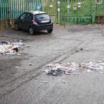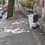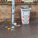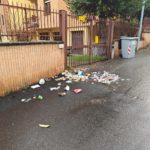 Cassonetti rivoltati e rifiuti dell’indifferenziata a terra su tutta la via di Santa Maria in Gradi e delle limitrofe Via del Carnaro e Via Monte Cengio, fino ad arrivare all’ingresso “posteriore” della scuola Vanni.