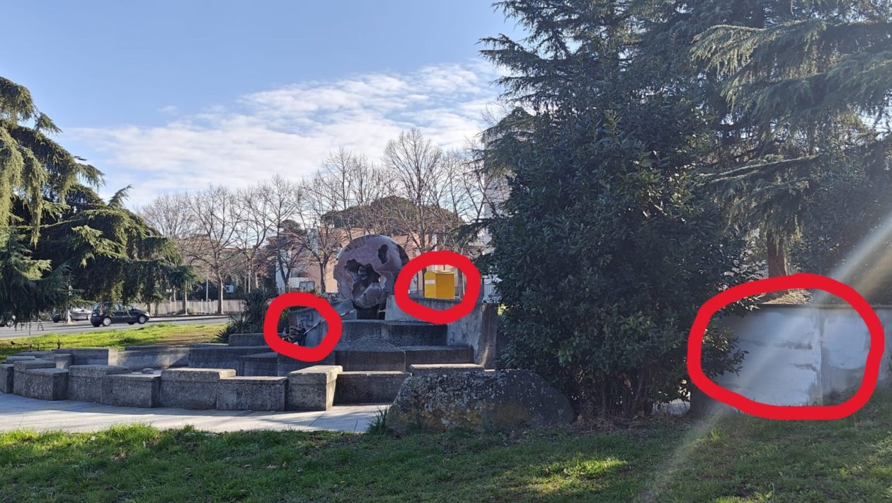 Tolta quella in primo piano, tolta l’altra che compariva sul fianco del punto di raccolta degli indumenti usati, ma quella sulla fontana ancora persiste.