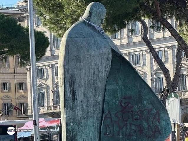 L’immagine della statua, già finita al centro delle polemiche nei giorni scorsi dopo essere stata fotografata con una kefiah durante un precedente presidio, è tornata a circolare rapidamente sui social, suscitando sdegno e nuove discussioni.