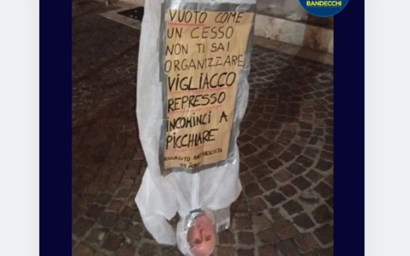 TERNI — Un fantoccio con il volto del sindaco di Terni, Stefano Bandecchi, è stato ritrovato appeso a testa in giù davanti all’ingresso del Comune (Palazzo Spada, piazza Mario Ridolfi) nella notte tra sabato e domenica.