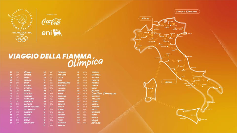 La Fondazione Milano Cortina 2026 ha reso noto il percorso della fiamma olimpica e paralimpica.  Tra le tappe anche a Viterbo.  Il viaggio inizierà da Roma sabato 6 Dicembre e il giorno seguente passerà per Viterbo.