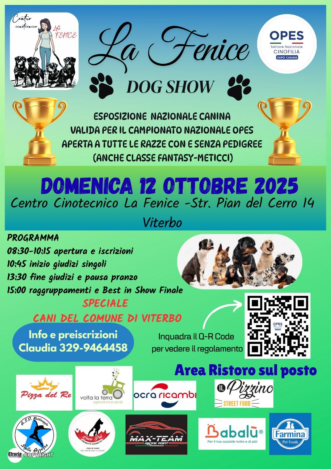 Domenica 12 ottobre si svolgerà a Viterbo (Pian del Cerro) “La Fenice Dog Show”, competizione di esposizione nazionale cinofila di bellezza, valida come prova di campionato nazionale Opes Italia Cinofilia.