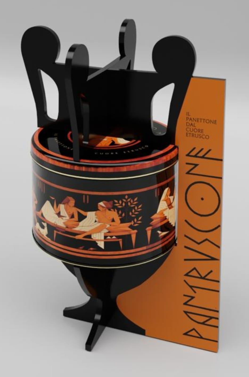 La confezione in latta ripropone le decorazioni pittoriche che venivano rappresentate nei vasi etruschi a figure rosse dove comparivano scene di vita quotidiana o mitologiche.