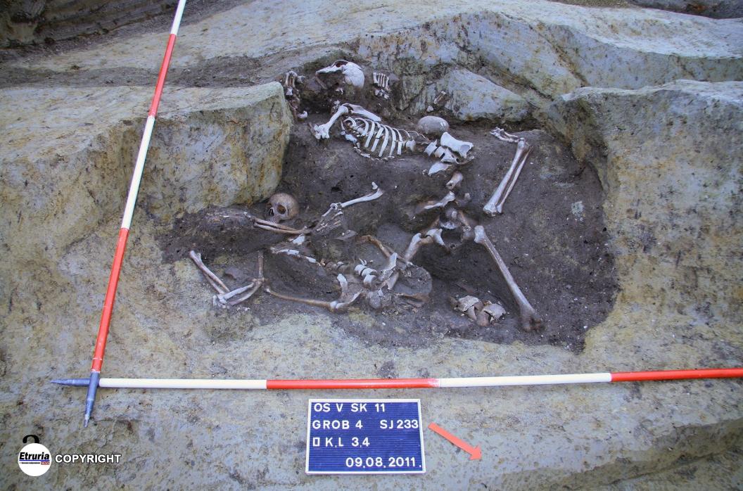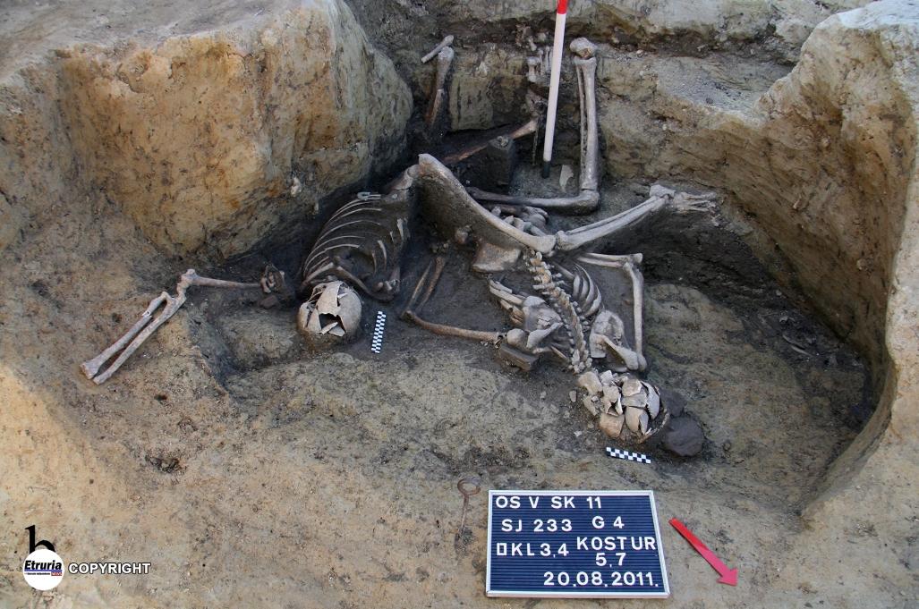 Fra i pochissimi materiali associati spicca una moneta coniata nel 251 d.C. a Viminacium, indizio cronologico che converge con le datazioni al radiocarbonio nel collocare l’episodio nella metà del III secolo.