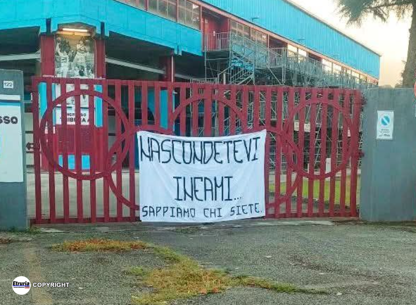 RIETI – Clima di tensione nel capoluogo sabino dopo l’agguato al pullman dei tifosi del Pistoia. Nella notte, sui cancelli del PalaSojourner, è apparso uno striscione con la scritta: “Nascondetevi infami, sappiamo chi siete”. Un messaggio intimidatorio che, secondo gli inquirenti, sarebbe rivolto a chi tra gli ultrà della “Curva Terminillo” ha deciso di collaborare con le autorità e fornire testimonianze sull’episodio che domenica scorsa è costato la vita a Raffaele Marianella, 65 anni, secondo autista del bus colpito dai sassi lanciati dal gruppo di tifosi reatini.