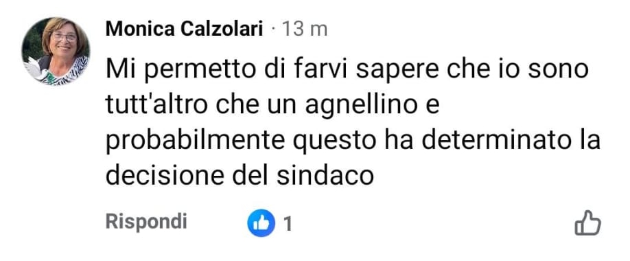 Pur trovandosi con un forte consenso e un’opposizione molto silente e garbata, ha trovato il modo di far sapere alla comunità che amministra che «È venuto meno il rapporto di fiducia tra il Sindaco e l’Assessore Monica Calzolari e tale situazione ha effetti negativi sull’attuazione del programma di mandato e sull’unità di indirizzo politico-amministrativo dell’Amministrazione».