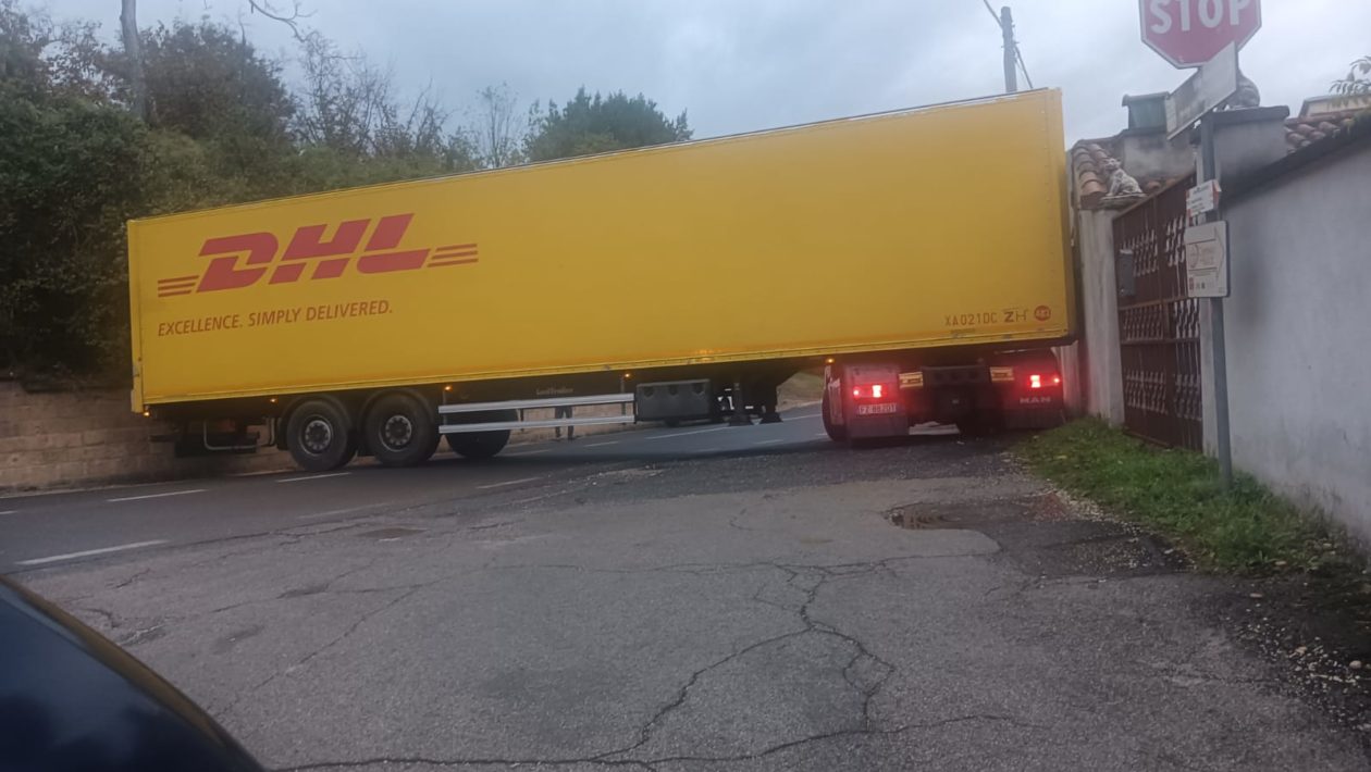 Intorno alle 7, un mezzo pesante della Dhl, probabilmente per fare un’inversione di marcia, è rimasto incastrato tra i muri di cinta di due abitazioni poste nelle due opposte carreggiate.