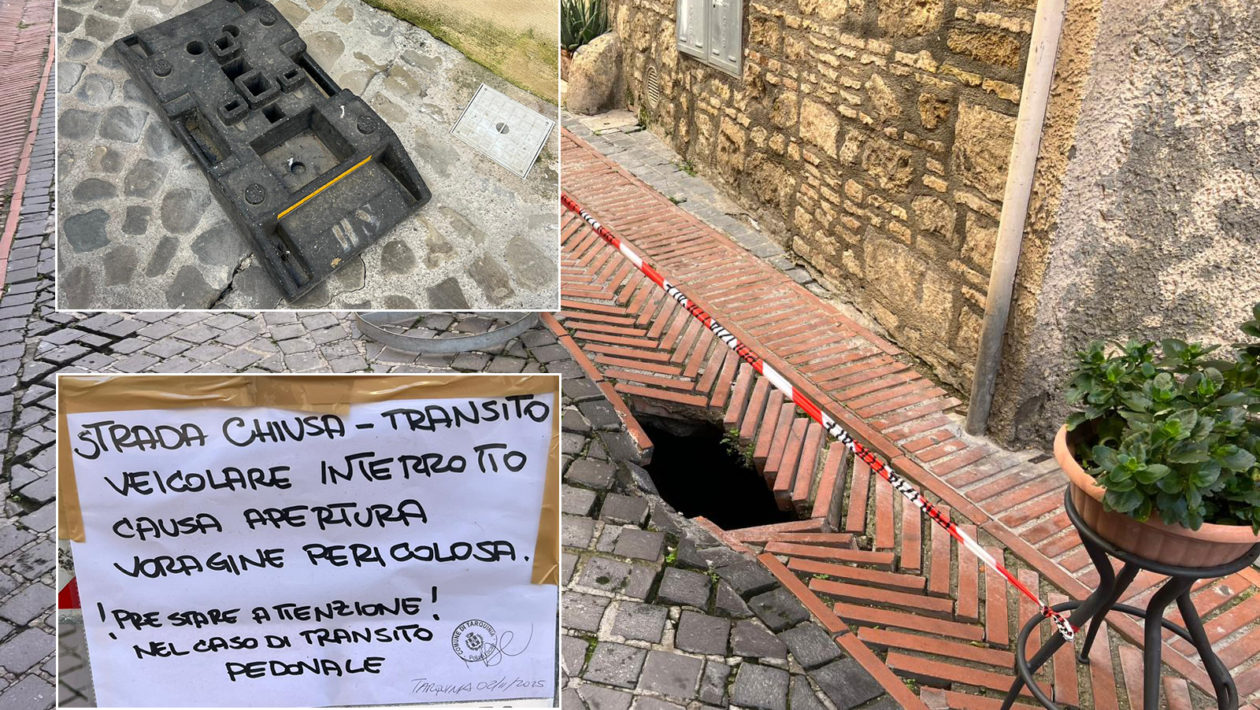 Da una parte l’amministrazione ha chiuso una via con un cartello scritto a mano con un pennarello, dall’altra ha coperto una parte di buca con la base di un segnale di divieto