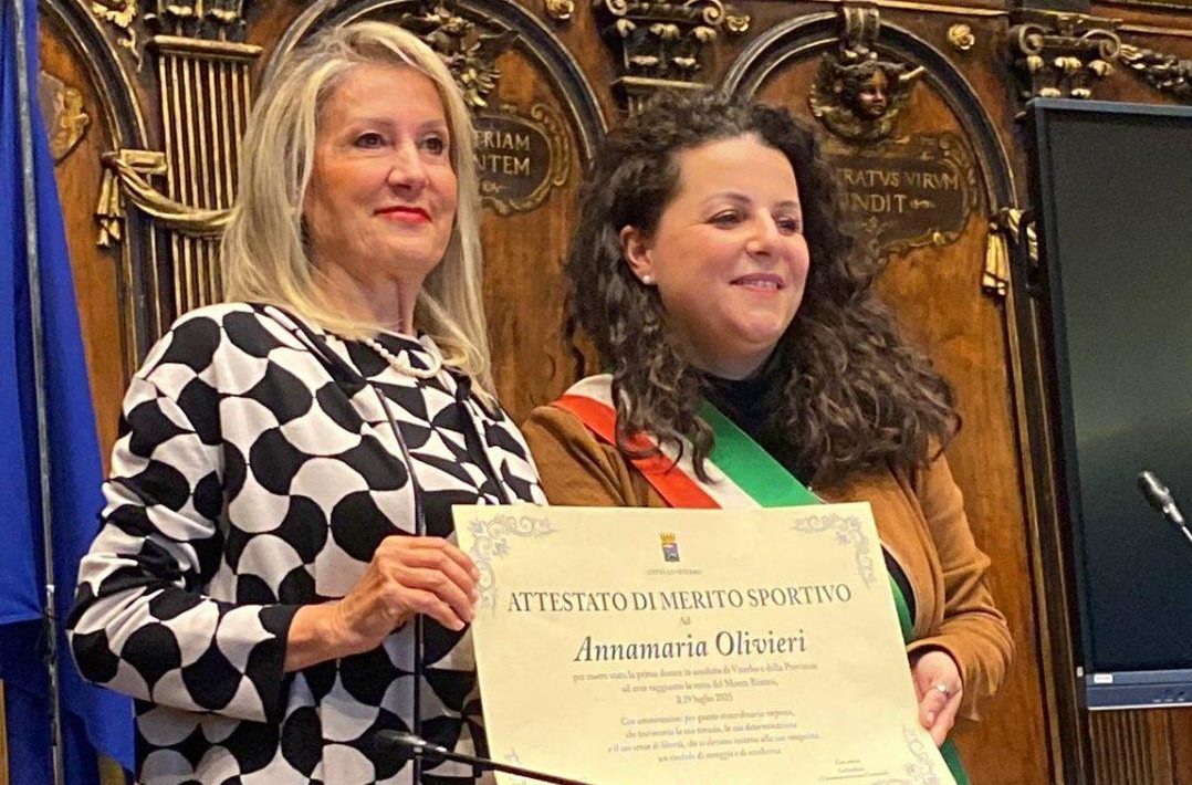 VITERBO – Importante riconoscimento per la sportiva Annamaria Olivieri che ieri ha ricevuto, dalla sindaca Chiara Frontini, l’attestato per merito sportivo per essere stata la prima donna di Viterbo e provincia a raggiungere la cima più estrema del Monte Bianco.
