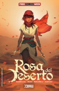 “Quest’anno al freddo di dicembre risponderemo con le torride sabbie della Siria segnate dai passi leggeri di Nizarita, la spietata combattente che abbiamo incontrato in Nero, la fortunata serie creata dai fratelli Emiliano e Matteo Mammucari. Incontrato, ma non conosciuto bene. Cosa sappiamo della sua vita? Della ragazzina orfana, indisciplinata e ribelle, che si è fatta strada in un mondo prettamente maschile fino a emanciparsi dalla Setta degli Assassini e diventare la combattente perfetta? Una domanda che troverà risposta in Rosa del Deserto, un’avventura dallo sguardo estremamente peculiare, come i nomi del cast artistico tutto al femminile dimostrano, disponibile in libreria e fumetteria nei primi mesi del 2026, con qualche prima pagina fin d’ora. Vi auguriamo anche quest’anno buona Free Comics Week, dandovi appuntamento nelle tante fumetterie che partecipano all’iniziativa.”