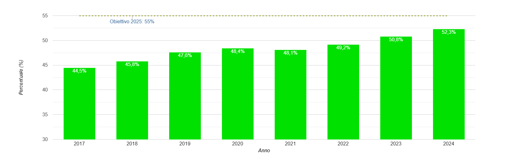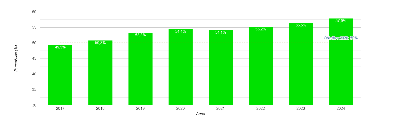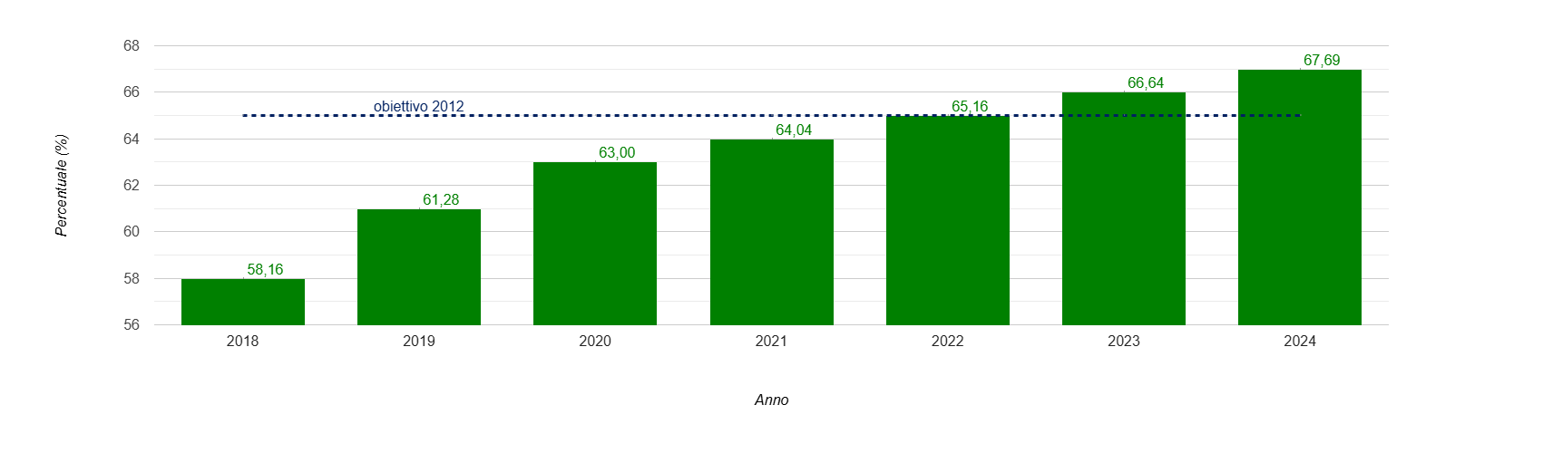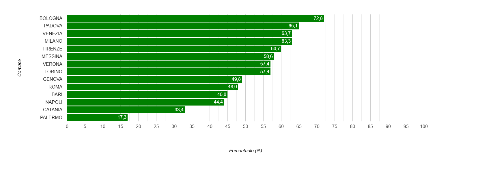 L’unica provincia a superare la soglia del 65% prevista per legge già nel 2012 è Viterbo (67,3%). Seguono Latina al 64,3%, Frosinone al 63,7%, Rieti al 59,1% e Roma al 54%, ancora lontana dagli standard minimi. E proprio la Capitale, con 1,64 milioni di tonnellate annue e 598 kg di rifiuti pro capite, rimane la città italiana che produce più rifiuti in assoluto, pur crescendo lievemente nella differenziata.