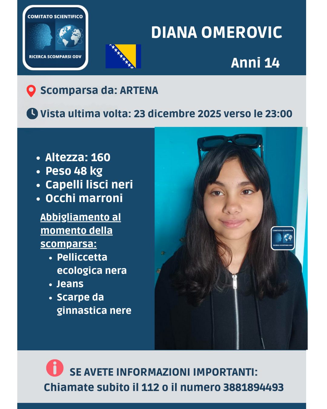 ROMA – Ore di crescente apprensione ad Artena per la scomparsa di Diana Omerovic, 14 anni, di cui non si hanno più notizie dalla serata del 23 dicembre 2025.