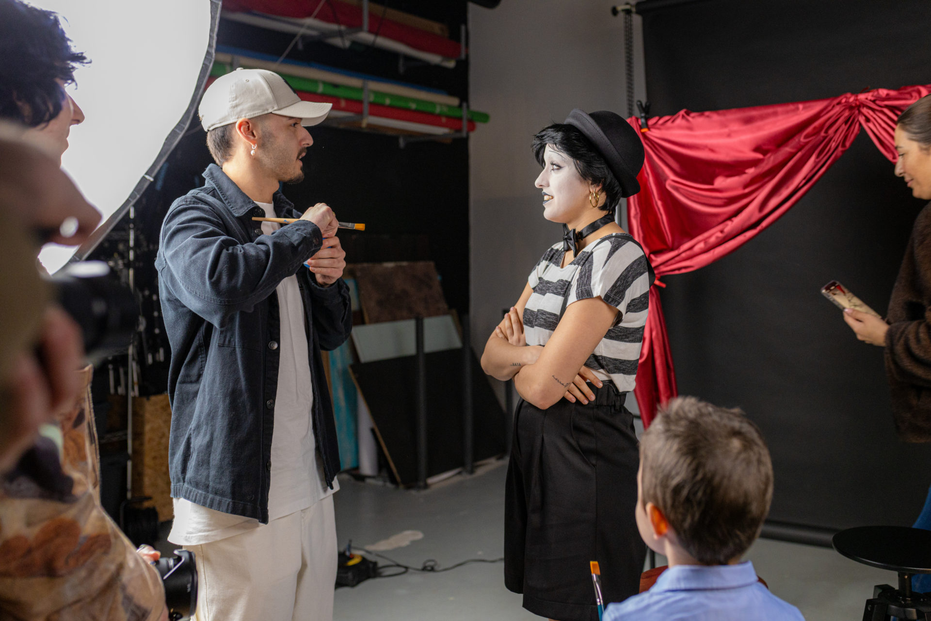 un mimo in bianco e nero, rigido, immobile, simbolo di un mondo adulto spesso spento e condizionato, viene toccato da un bambino che gli “macchia” il volto con il colore.