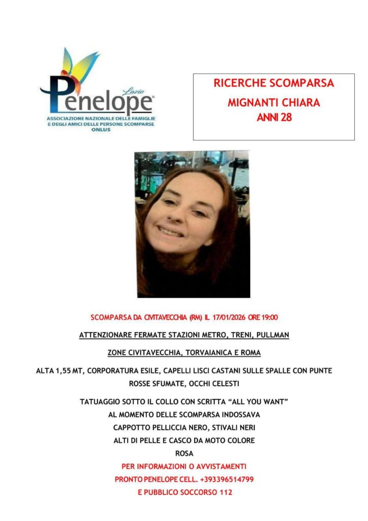 CIVITAVECCHIA – Sono in corso le ricerche di Chiara Mignanti, 28 anni, scomparsa nel tardo pomeriggio di venerdì 17 gennaio 2026 da Civitavecchia. L’allarme è stato diffuso dall’Associazione Penelope Lazio, da anni impegnata nel supporto alle famiglie delle persone scomparse.