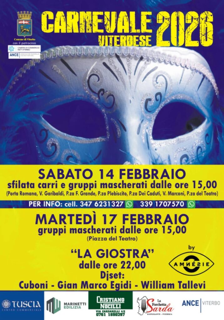 Organizzato con il patrocinio del Comune di Viterbo e il coinvolgimento di numerosi sponsor e realtà del territorio, il Carnevale Viterbese si conferma così un appuntamento capace di unire tradizione, divertimento e partecipazione collettiva, riportando il centro cittadino a essere, per due giorni, un grande palcoscenico a cielo aperto.