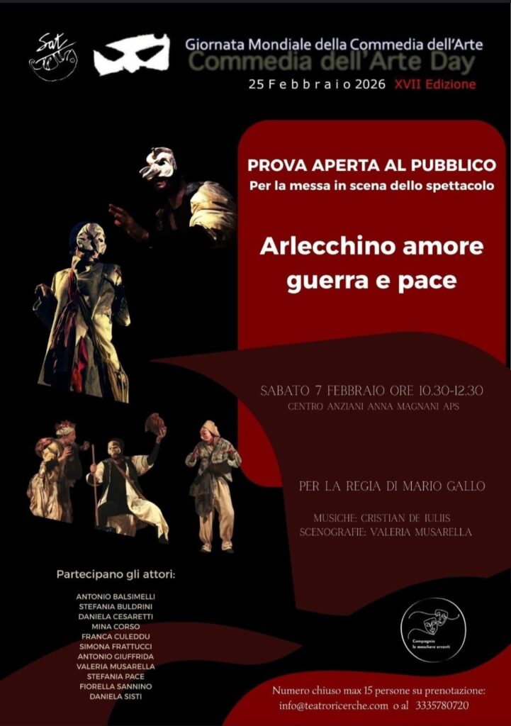 CIVITAVECCHIA – C’è un filo rosso che lega il Carnevale alle radici più profonde della cultura italiana, un filo che la compagnia “Maschere erranti” intende riannodare il prossimo sabato 7 febbraio. In occasione della XVII Edizione della Giornata Mondiale della Commedia dell’Arte, prevista per il 2026, il gruppo teatrale offrirà al pubblico un’esperienza insolita e affascinante: una prova aperta dello spettacolo “Arlecchino… amore, guerra e pace”.