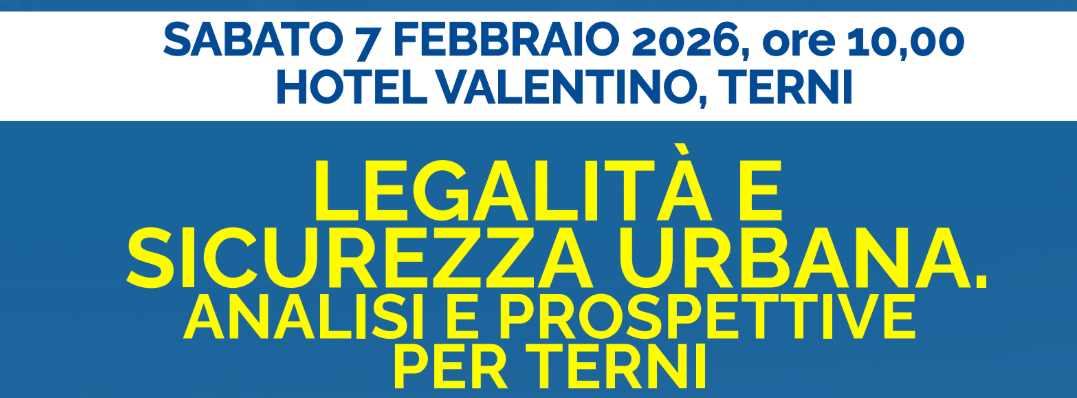 TERNI – Riceviamo e pubblichiamo – La sicurezza è oggi una delle preoccupazioni più sentite dai cittadini e costituisce un fattore decisivo per la qualità della vita, la coesione sociale e lo sviluppo dei territori. Da questa consapevolezza nasce il convegno “Legalità e sicurezza urbana: analisi e prospettive per Terni”, promosso dalle forze politiche del centrodestra (Fratelli d’Italia, Forza Italia, Lega, Umbria Civica, Noi Moderati e UDC), in programma il 7 febbraio 2026 alle ore 10.00 a Terni presso l’Hotel Valentino, con la partecipazione dei segretari regionali delle forze politiche promotrici.