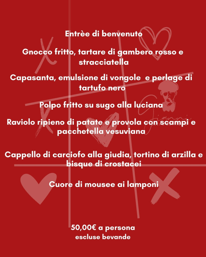 La serata si apre con un’entrée di benvenuto, seguita da una sequenza di portate studiate per accompagnare il brindisi dell’amore: gnocco fritto con tartare di gambero rosso e stracciatella, capesanta con emulsione di vongole e perlage di tartufo nero, polpo fritto su sugo alla luciana. Spazio poi a un primo piatto di carattere, il raviolo ripieno di patate e provola con scampi e pacchetella vesuviana, prima di arrivare al secondo, cappello di carciofo alla giudia con tortino di arzilla e bisque di crostacei. A chiudere la cena, il dessert: cuore di mousse ai lamponi.