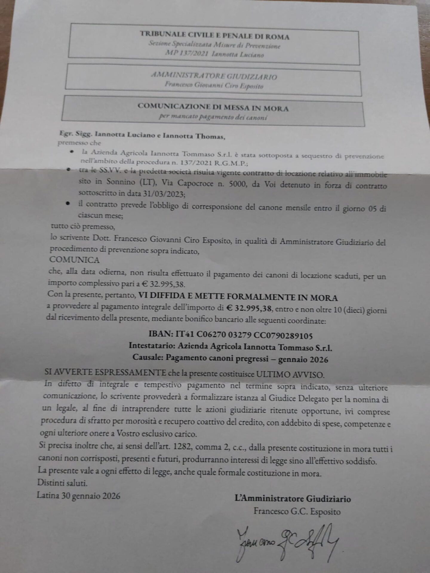 Ciò che indigna non è solo l’atto in sé, ma la totale assenza di empatia e umanità. Tra i destinatari del provvedimento figurano sei anziani ultraottantenni, pazienti oncologici e giovani la cui salute è stata devastata dallo stress e dalle conseguenze di questa infinita odissea giudiziaria. Eppure, l’amministratore Esposito sembra avere priorità selettive: dichiara di non avere tempo per redigere gli inventari, non trova il tempo di aprire 36 scatoloni di documenti vitali per l’esercizio del diritto di difesa degli imputati, ma trova miracolosamente il tempo per firmare sfratti che condannano alla strada persone fragili e malate.
