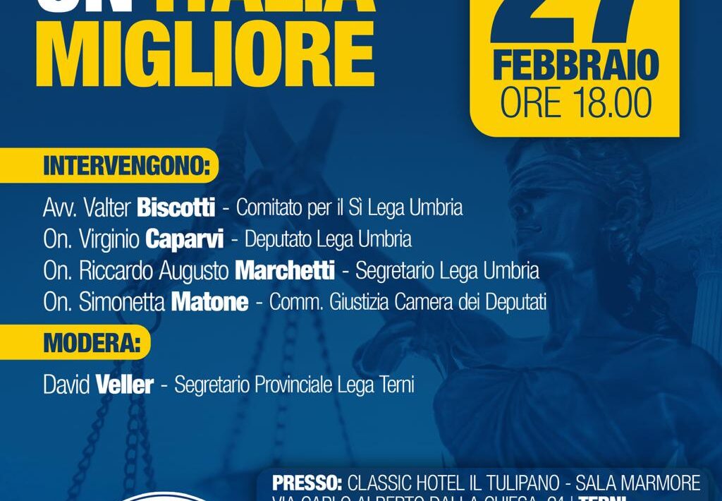 Venerdì 27 febbraio alle ore 18:00, presso il Classic Hotel Tulipano di Terni, sarà presente l’On. Simonetta Matone, deputata della Lega, magistrato e membro della Commissione Giustizia alla Camera. L’incontro, aperto alla cittadinanza, rappresenta un’importante occasione di approfondimento sui temi del referendum sulla giustizia del 22 e 23 marzo, un passaggio decisivo per una riforma attesa da troppi anni e fondamentale per garantire maggiore equilibrio, trasparenza ed efficienza al sistema giudiziario italiano.