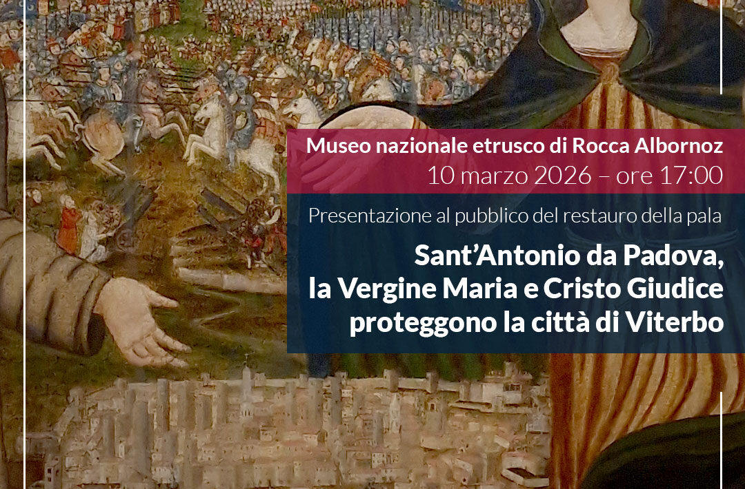 VITERBO – Martedì 10 marzo, alle ore 17:00, presso il Museo nazionale etrusco della Rocca Albornoz, sarà inaugurata l’esposizione della pala cinquecentesca “Sant’Antonio da Padova, la Vergine Maria e Cristo Giudice proteggono la città di Viterbo”, restituita alla fruizione pubblica al termine di un articolato intervento di restauro promosso dalla Direzione regionale Musei nazionali Lazio del Ministero della Cultura, nell’ambito del progetto di riqualificazione della Basilica di San Francesco alla Rocca.
