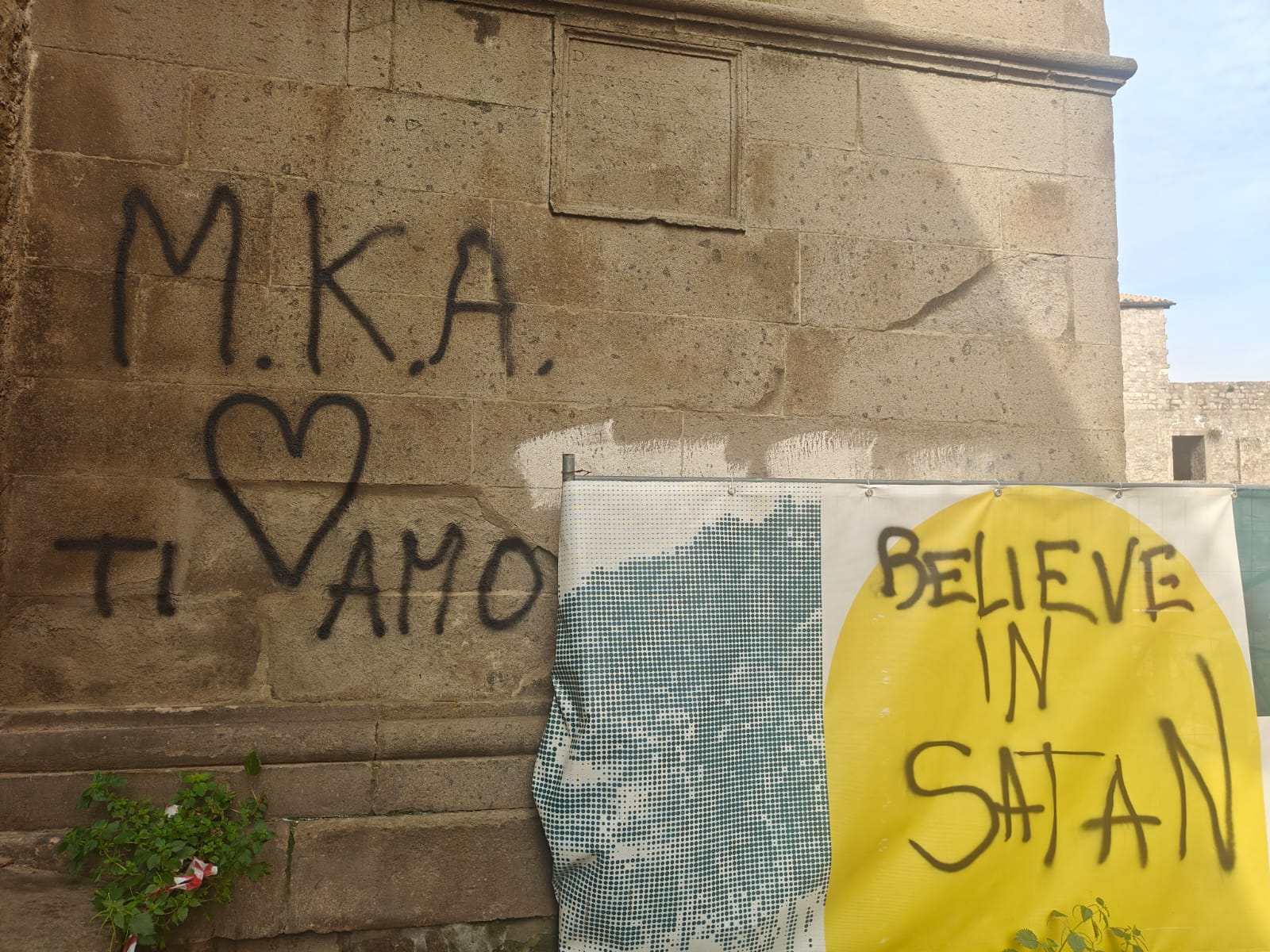 Sui muri della chiesa e sulle porte in legno sono state tracciate frasi e simboli riconducibili a un immaginario satanico: tra queste “Satan church”, il numero “666” – tradizionalmente associato al cosiddetto “numero della bestia” citato nel libro dell’Apocalisse – e alcune croci rovesciate. In un’altra scritta compare anche la frase “Io credo in Satana”.