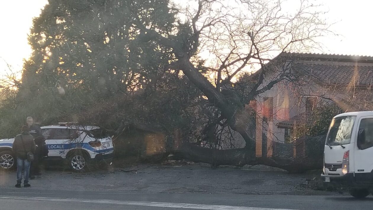 Vitorchiano – Enorme quercia si schianta contro auto della polizia locale, sfiorata tragedia al Pallone (FOTO)