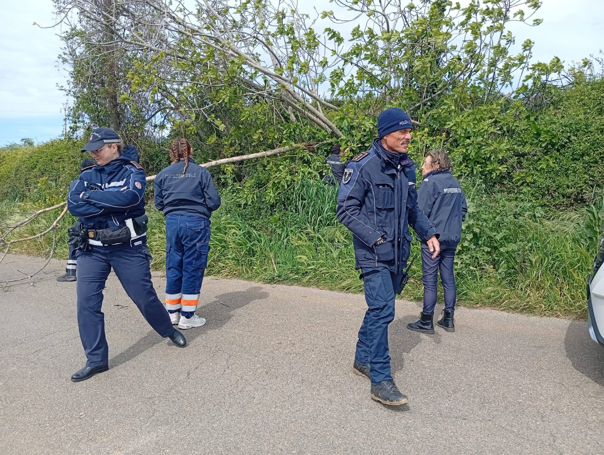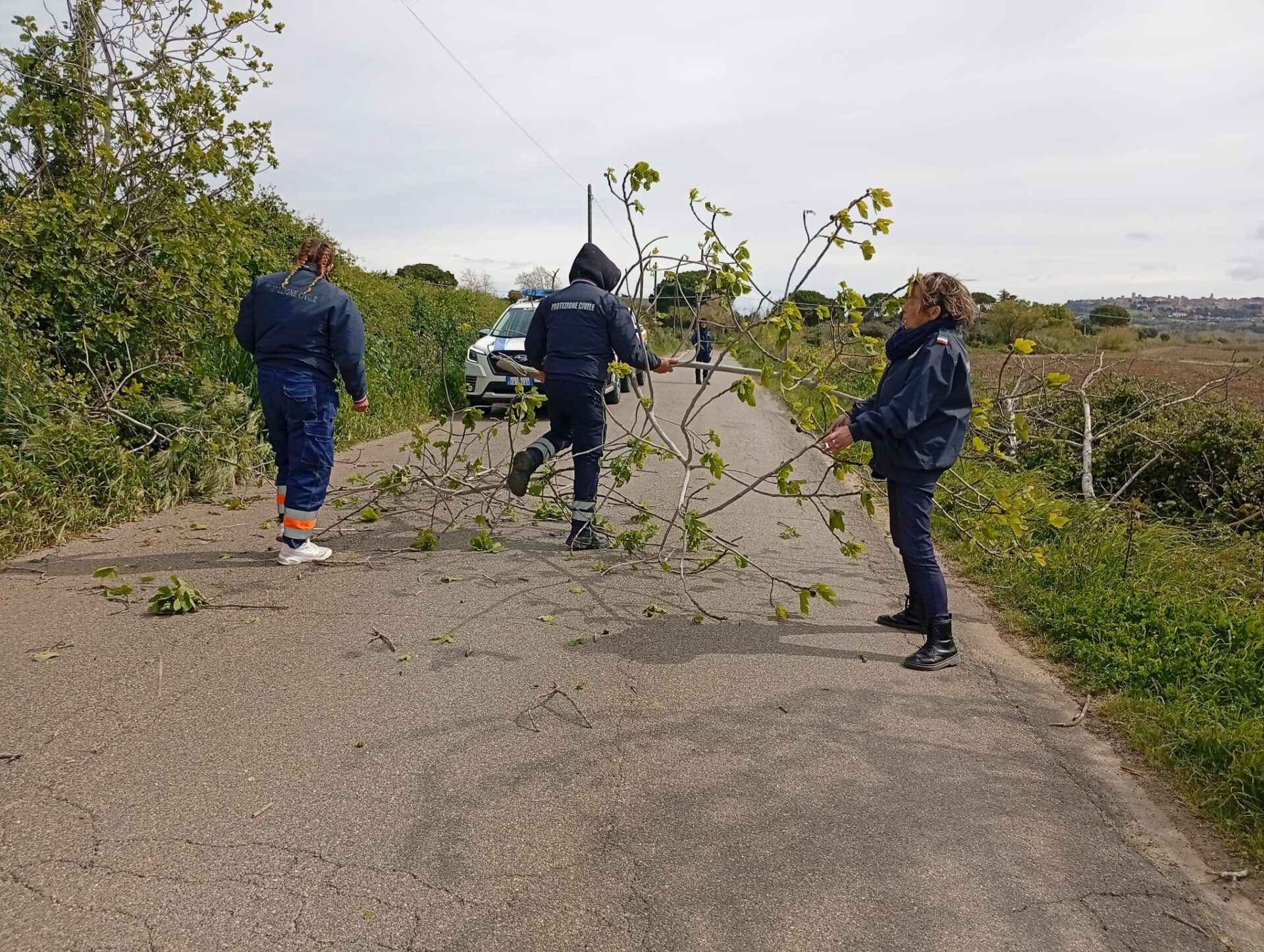 I volontari della AEOPC Tarquinia, insieme alla Polizia Locale, sono impegnati nella rimozione di grossi rami caduti sulla carreggiata.