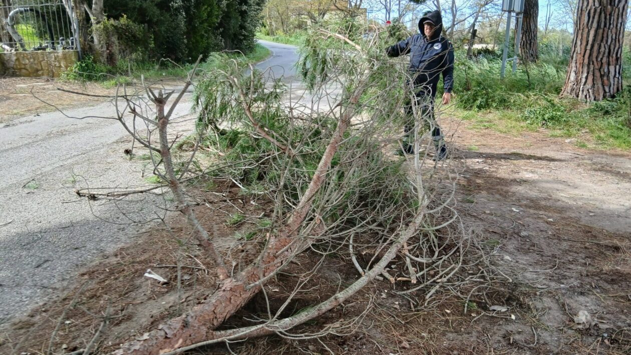 I volontari della AEOPC Tarquinia, insieme alla Polizia Locale, sono impegnati nella rimozione di grossi rami caduti sulla carreggiata.