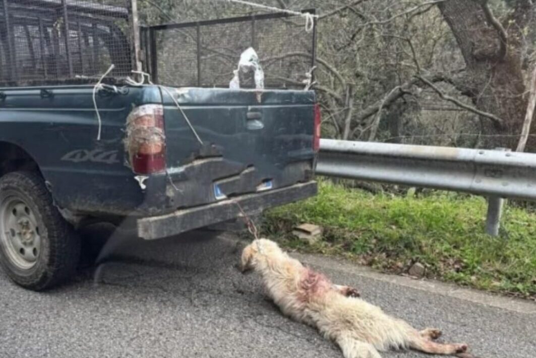 COSENZA – Un’immagine scioccante, capace di scatenare rabbia e sgomento, sta circolando in queste ore sui social. La foto, scattata a Longobucco, mostra il corpo senza vita di un cane trascinato e legato per il collo a un pick-up.