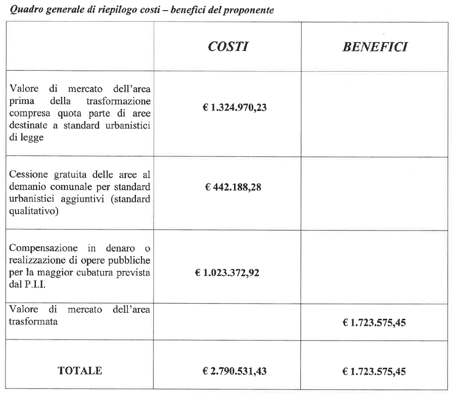 La cosa che colpisce subito è la stima che l’architetto Proli mette nero su bianco nella relazione allegata alla domanda di variante. Il valore di mercato dell’area prima della eventuale trasformazione (in altro) è di 1.324.970,23 euro. Come si evince dalla tabella allegata il valore finale dell’area autorizzata e trasformata è, sempre secondo Proli, di 2.790.531,43.