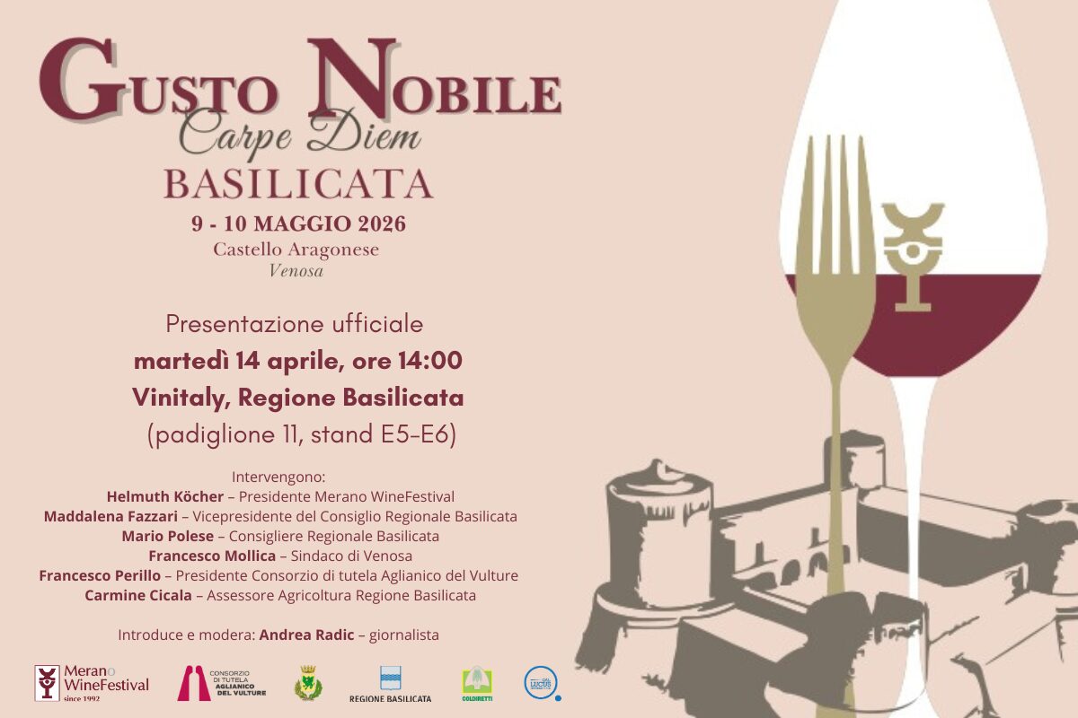 Verona, 15 aprile 2026 – È stata presentata ieri a Vinitaly, presso lo stand della Regione Basilicata, la prima edizione di Gusto Nobile Basilicata by Merano WineFestival, la manifestazione che dall’8 al 10 maggio 2026 porterà a Venosa (PZ) degustazioni, masterclass, show-cooking e momenti di approfondimento dedicati ai grandi vini e ai prodotti del territorio lucano. L’iniziativa è promossa dalla consolidata realtà altoatesina, in collaborazione con il Consorzio di Tutela dell’Aglianico del Vulture, la Regione Basilicata e il Comune di Venosa. La presentazione ufficiale ha rafforzato il posizionamento dell’evento come occasione di valorizzazione non soltanto del Vulture, ma dell’intera Basilicata come destinazione enogastronomica e culturale. Al centro dell’incontro è emersa con forza l’idea di una manifestazione capace di raccontare un territorio autentico, ricco di eccellenze produttive, storia e potenzialità turistiche.