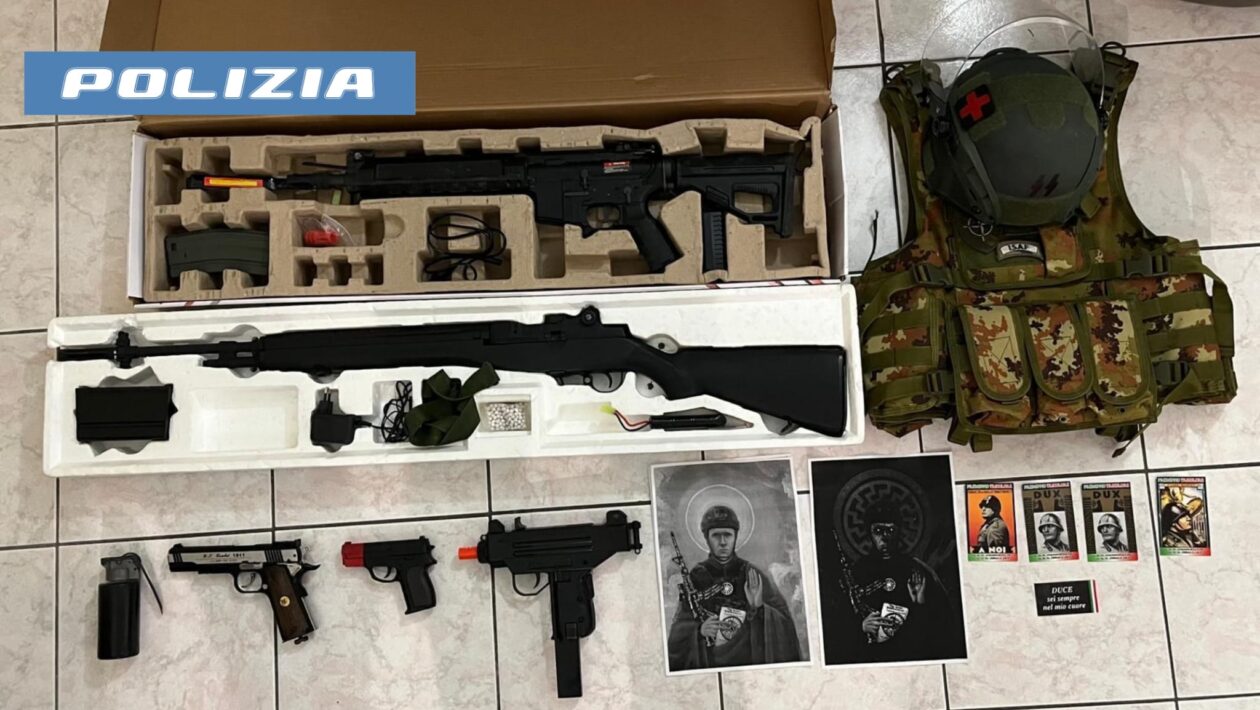 Durante le operazioni di rito, la Polizia ha rinvenuto e posto sotto sequestro: materiale iconografico: stampe raffiguranti Brenton Tarrant (responsabile della strage di Christchurch del 2019). Numerose armi ad aria compressa e con bollino rosso che distingue quelle giocattolo, attualmente al vaglio degli inquirenti per verificarne l’effettiva capacità offensiva.