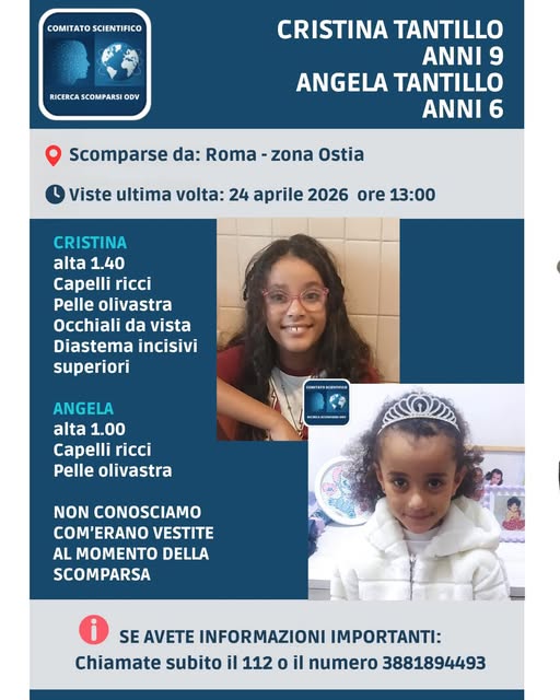 “Cristina e Angela sono scomparse da Ostia zona Fiamme Gialle, venerdì 24 aprile 2026 all’uscita da scuola. Le ha prelevate la loro mamma di nazionalità etiope di pelle più scura delle ragazze. Purtroppo non sono rientrate a casa e potrebbero viaggiare. Chiamate il 112 o il nostro numero: 388 189 4493.”