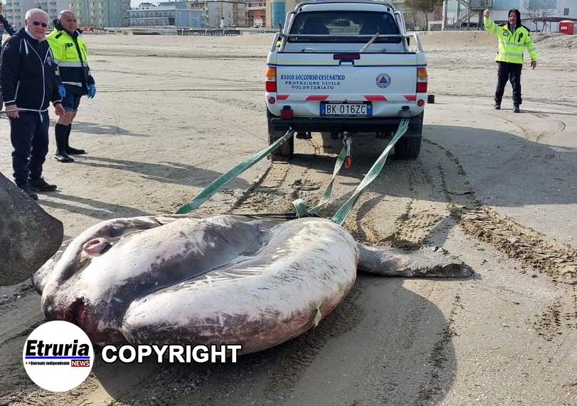 CESENATICO – Una tonnellata circa: è questo l’incredibile peso del pesce luna ritrovato sulle rive della spiaggia di Valverde a Cesenatico, sfortunatamente senza vita.