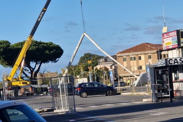 Viterbo – Sacrario, crolla una delle torri faro durante la rimozione: “Sfiorata una tragedia”